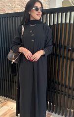 Elegant Simple black abaya made of Nada fabric with a practical design, adorned with chic pins for a modern touch. Comes with a matching sheila for a graceful look.