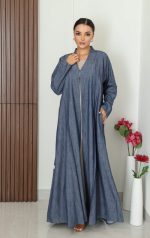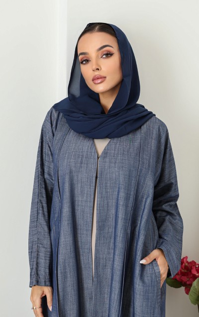 .عباية جينز خفيفة،مريحة وارقية لكل يوم. تصميم عملي بجيوب جانبية وشيلة متناسقة تكمل اطلالتك