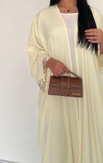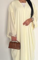 An elegant light yellow abaya made from Zoom fabric, with a Bahraini butterfly design, adorned with luxurious beadwork on the sleeves for a touch of sophistication, creating a fresh and feminine look, complemented by a matching sheila. without an inner dress.