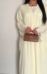 .عباية أنيقة باللون الأصفر الفاتح من قماش زوم، بتصميم بحريني على شكل فراشة، مرصعة بخرز فاخر على الأكمام يضفي لمسة من الفخامة، لإطلالة منعشة وأنثوية، مكتملة بشيلة متناسقة. بدون فستان داخلي