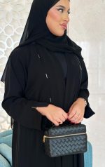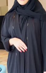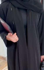 .عباية مفتوحة باللون الأسود من قماش ندى الانسيابي ، بتصميم مميز يزين الأطراف، وتأتي مرفقة بشيلة متناسقة، بدون فستان داخلي