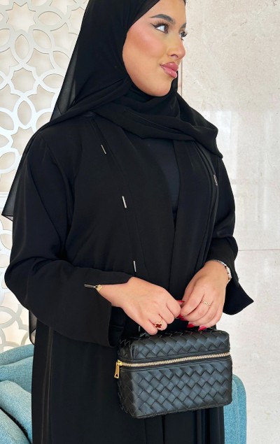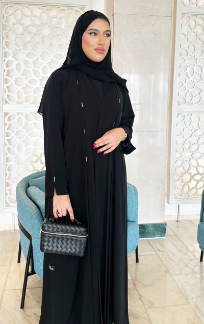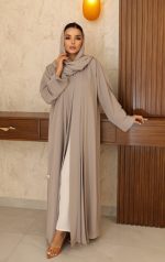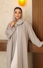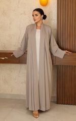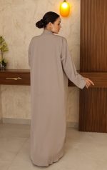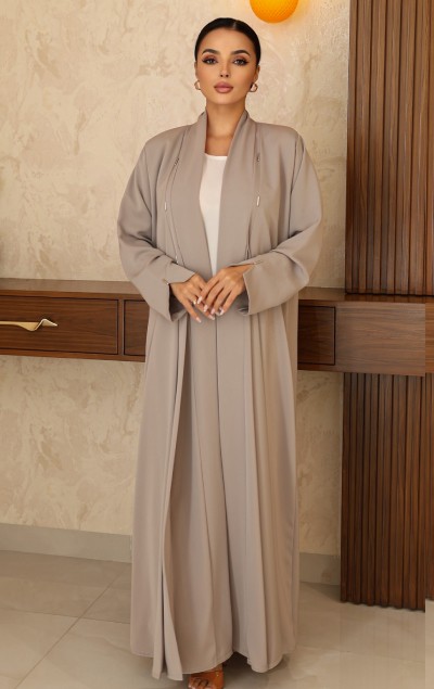 .عباية مفتوحة باللون البيج من قماش ندى الانسيابي ، بتصميم مميز يزين الأطراف، وتأتي مرفقة بشيلة متناسقة، بدون فستان داخلي
