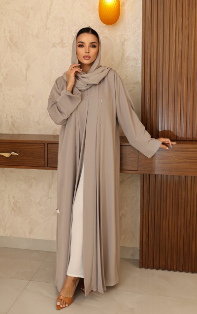 Open beige abaya made of nada fabric , featuring elegant detailing along the edges . It comes with a matching sheila and without an inner dress.