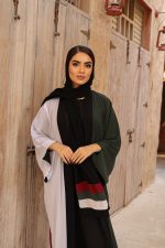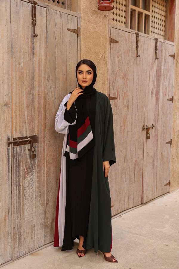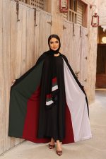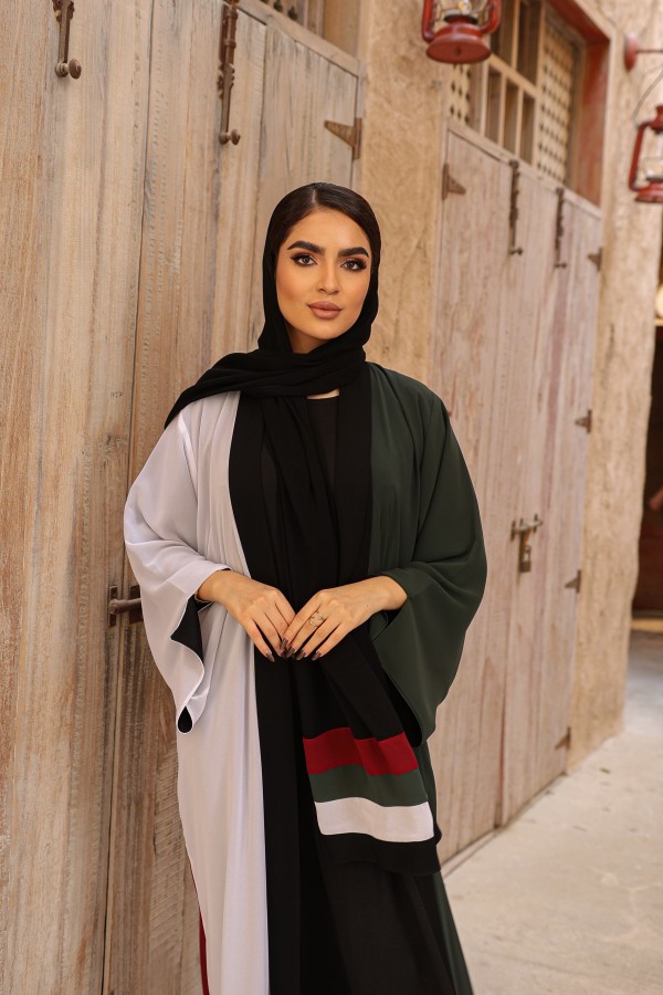 An elegant double face abaya crafted from flowing Nada fabric and accented with colored chiffon inspired by the UAE flag, designed in celebration of the National Day. Paired with a matching sheila, it offers a look that radiates pride and patriotism.