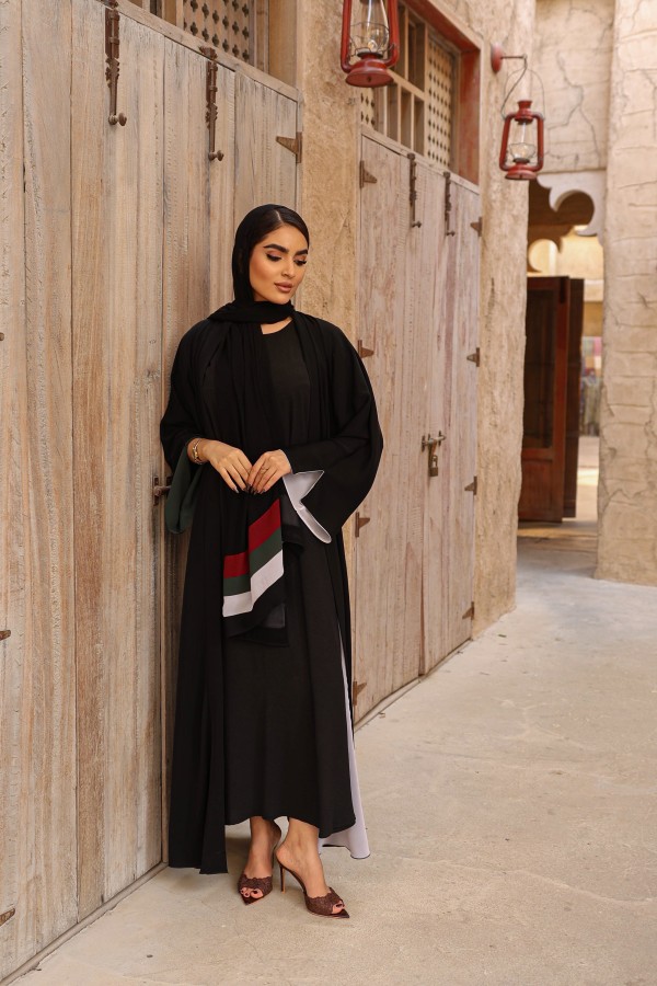 .عباية أنيقة تنلبس على الوجهين، مصممة من قماش ندى الانسيابي مع شيفون ملوّن بدرجات مستوحاة من ألوان العلم الإماراتي، احتفاءً بالعيد الوطني. تأتي مع شيلة متناسقة تمنحك إطلالة تنبض بالفخر والانتماء