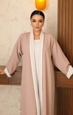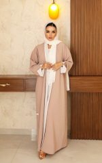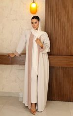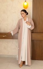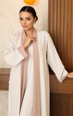 .عباية مفتوحة بتصميم عملي باللونين الوردي و الابيض ، مزدوجة الاستخدام، مصنوعة من قماش كراش اندونيسي، مكتملة بشيلة متناسقة لإطلالة أنيقة وعملية. بدون فستان داخلي
