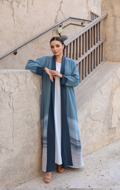 .عباية مفتوحة بتصميم أنيق يمكن ارتداؤها على الوجهين، مصنوعة من قماش الكريب الأسود والشيفون المزين بطبعة جلد النمر الجذابة، تمنحك إطلالة جريئة ومتألقة، وتأتي مع شيلة متناسقة دون فستان داخلي