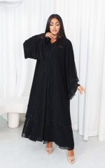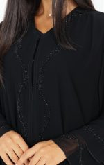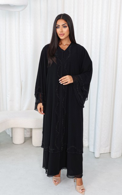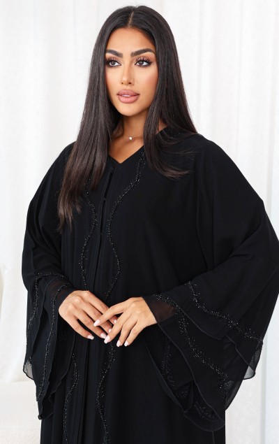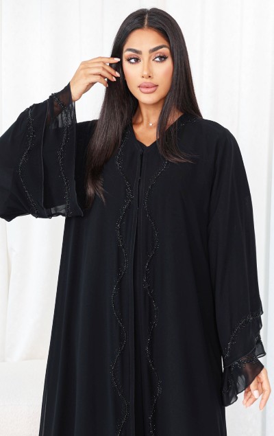 Elegant black abaya made of luxurious chiffon fabric, featuring a distinctive design adorned with refined beadwork for a radiant look, paired with a matching sheila for a touch of sophistication.