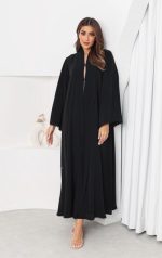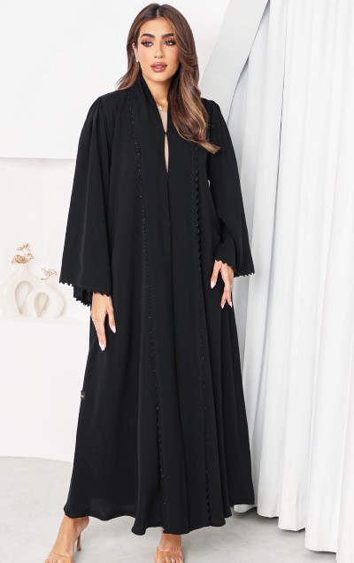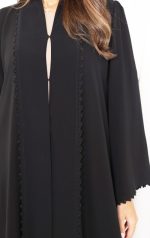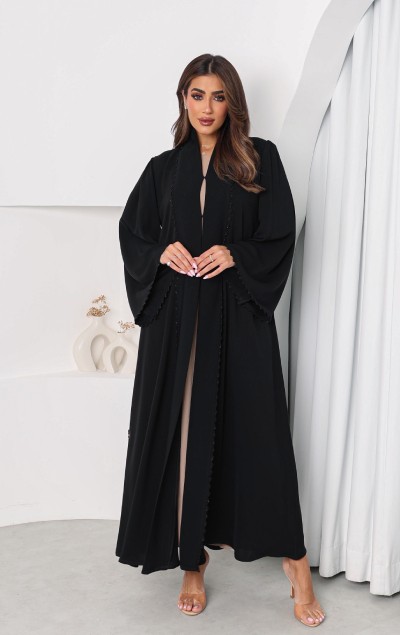 Elegant black abaya crafted from flowing Nada fabric, adorned with exquisite handcrafted embroidery that adds a touch of luxury and refinement. Paired with a matching sheila for a graceful and sophisticated look.