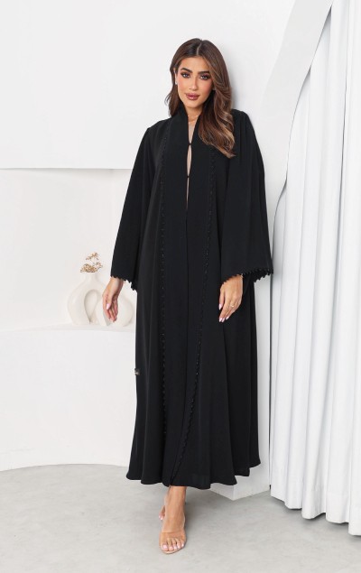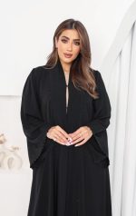 .عباية سوداء بتصميم أنيق راقٍ، مصنوعة من قماش ندى الانسيابي، ومزينة بتطريز يدوي فاخر يضفي لمسة من الجمال والرقي، تأتي مع شيلة متناسقة لإطلالة فخمة ومتألقة