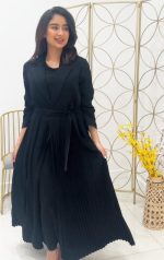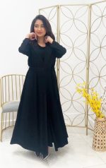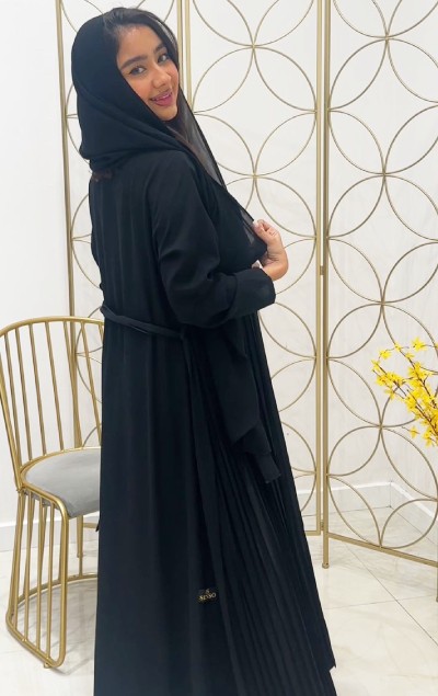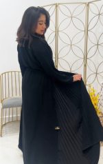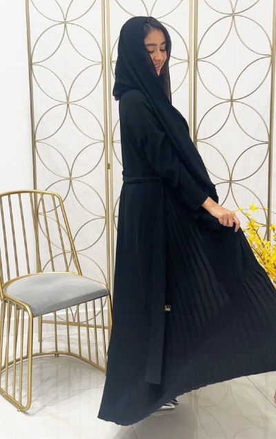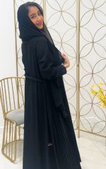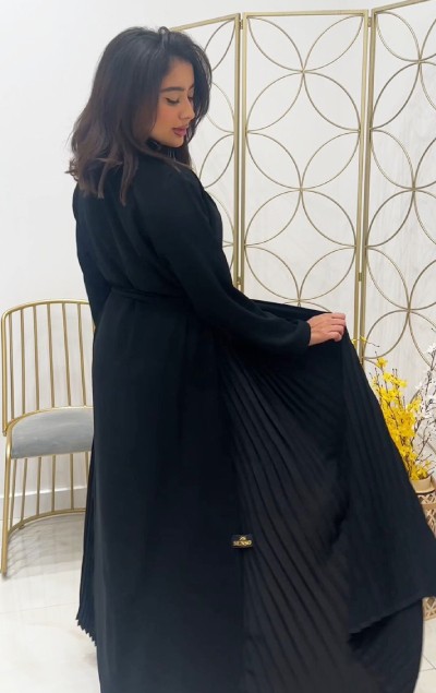Open black abaya made of premium Turkish fabric, designed with pleated details for an elegant formal look. Comes with a sheila and belt, without an inner dress.