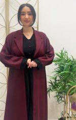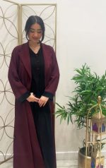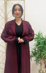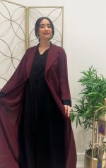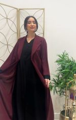 .عباية أنيقة تجمع بين اللونين الأسود والعنّابي، بتصميم رسمي مستوحى من البليزر، مصنوعة من قماش ندى ، وتأتي مع شيلة متناسقة لإطلالة راقية وعصرية