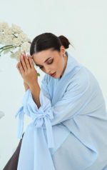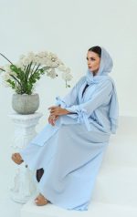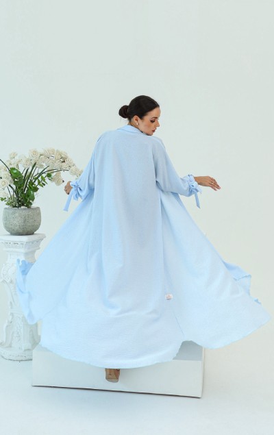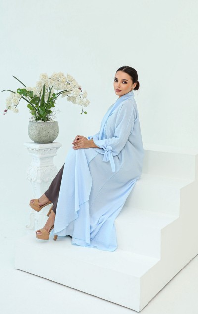 .عباية مفتوحة باللون الأزرق السماوي، مصنوعة من قماش تركي، يرافقها فستان باللون البني من قماش سي واي التركي، وتأتي مع شيلة متناسقة لإطلالة هادئة تنبض بالأنوثة والرقي