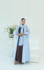 Open sky blue abaya made from Turkish fabric, accompanied by a brown inner dress crafted from Turkish CY fabric, paired with a matching sheila for a calm and feminine look full of elegance.